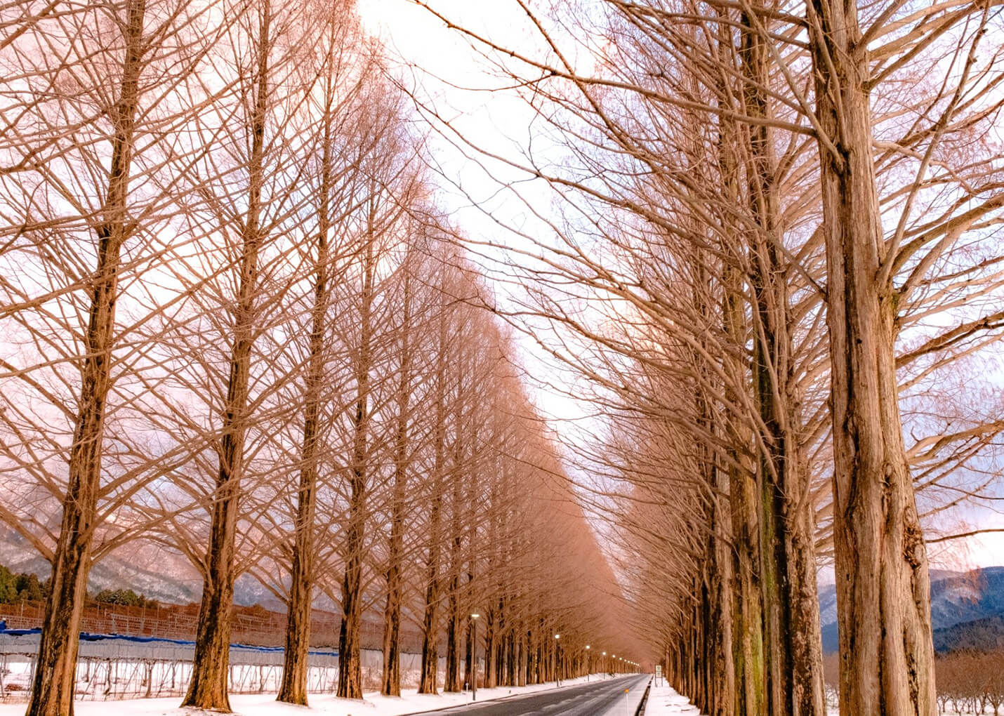 近くには、四季折々の景観が楽しめる「メタセコイア並木」があり、